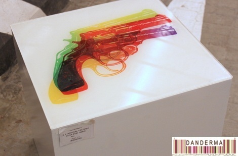 How about this retro looking white cube with colored guns print on top? Lovely!