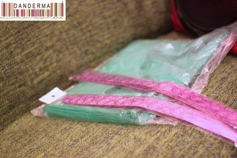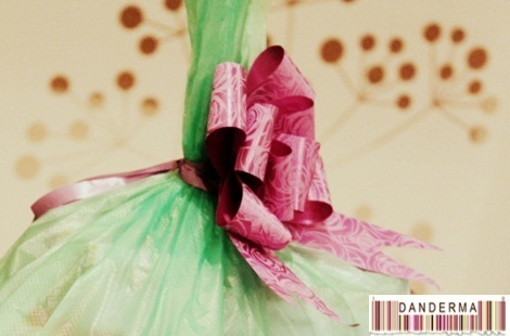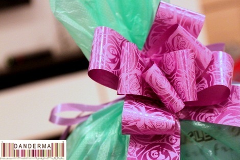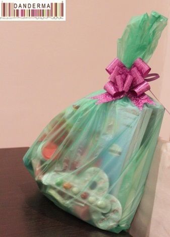 Oversized green bags that are NO WAY considered elegant. Alongside a purple ribbon thing that if you pull on the side turns into a hideous flower shaped wrapped. Just perfect! Here is one filled bag of goodies.