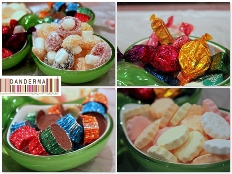 In the center of the coffee table I have placed a bowl with four different kinds of 80s beloved chocolates: Barmait, Coconut, Macintosh Quality Street, and Colored cups.