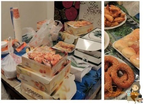 At the time of Palm Palace’s food arrival my husband arrived with the food I had ordered from Cesars: Pizzas, mini pizzas, Zaatar Pizza, chicken chapati sandwiches, falafel sandwiches, white cheese fatayer, kiri cheese balls, and cheese croissants. The table was full of boxes! This is how it looked when Swera and Pink Girl had arrived at 7 PM I borrowed and cropped this picture from Swera’s (post).