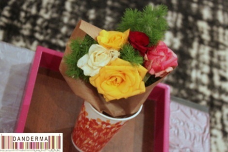 On Wednesday I went to the Co-Op before coming home from work to set up for the party. First, I bought some old wilted roses and arranged them in the old cocktail juice papercup as a vase. I spread my tables with the plastic disposable covers used as “sma6″ for the food.