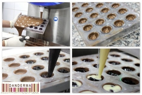 In every step of production the chocolate molds has to go inside a cooling machine via a conveyor belt and spend some time inside to cool down and set a little before being used in the next step.