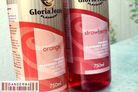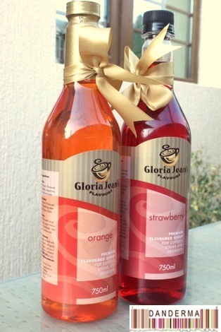 Two bottles of flavored syrups in orange and strawberry. You can add them to any hot or cold drink.