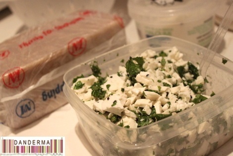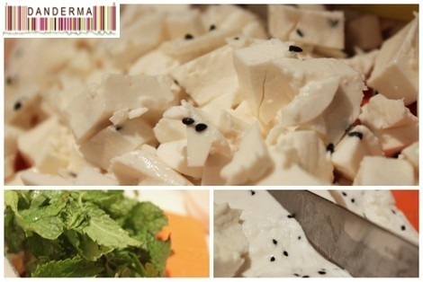 Now if I’m using akawi cheese I need to have it soaking in water for two days otherwise it would turn out too salty. Two days later I wash it and chop it into cubes with the halloum cheese, add some chopped fresh herbs, whatever I can find, and mix well.
