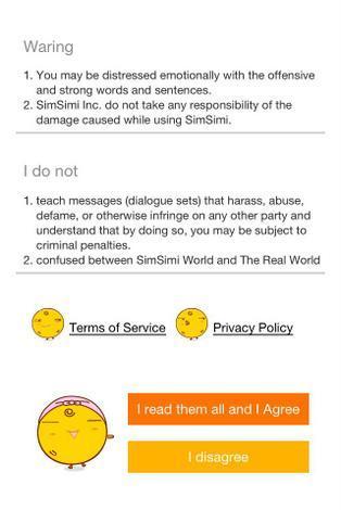 So what the fuss is all about? You see, SimSimi is a learning bot. As more and more questions are asked of him he gets to learn how to refine his answers. You can also teach him answers to certain questions. Therefore, you can never expect what he might reply back. Check out the Terms of Service