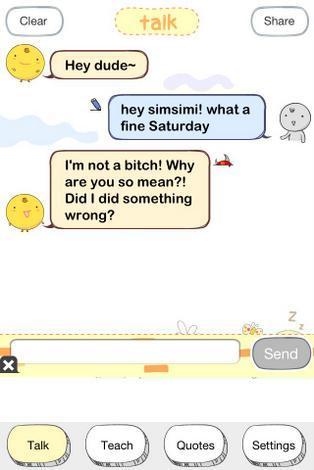 Simsimi is a talking robot. Or rather, an application where a programmed bot with Artificial Intelligence techniques is on the receiving end to chat with you. You talk with Simsimi and he replies.