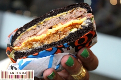 The next burger was the Hakooka, the sister’s friend burger that is. It comes in ink black bun. I’m not sure why the bun is black, is it just food coloring or squid ink, but it sure looked different. Good different that is. 9ej 7akooka!