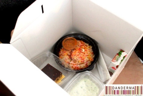 Inside the lunch box: Chicken Byriani, yogurt, apple juice, and Chocolate shortcut cake.