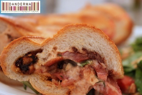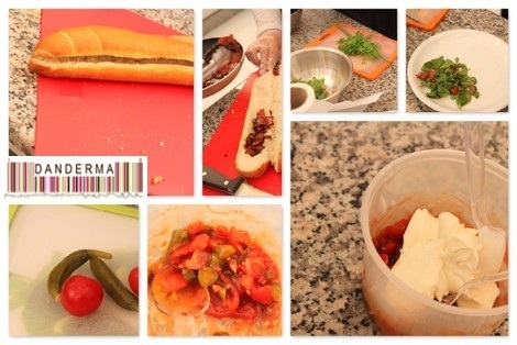 What’s inside? Kil khair insha2 Allah. A white baugette spread with a thin layer of Nuttella. Stuffed with the Bacon Peanuts Siracho Nuttella and herbs mix, and topped with the tomato pickles cream cheese mix, some rocket leaves, and some tomato slices.
