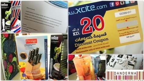 The set of knives we’ve been using, Brown multi quick devide, the apron , a 20 KD voucher for Xcite website, a collection of pinapple scented fruttini shower and body creams set, and lazurd biscuits.