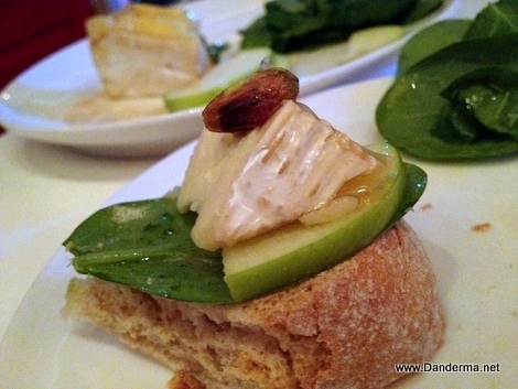 First, bread. Next, a leaf of baby spinach or two. Topped by a salted slice of green Apple, a hunk of honey drizzled creamy Brie cheese, and finished off with one honey coated pistachio. Now that’s what I call a perfect bite with a marriage of textures and flavors that is simply lipsmacking