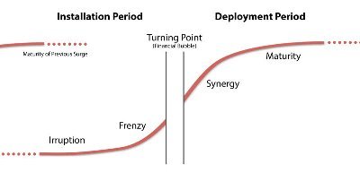 Carlota Perez is a well known economics scholar and her framework to explain major technological disruptions is well quoted. Basically she distinguishes an initial installation phase, followed by a deployment phase. But more importantly, her framework predicts a major crisis between both phases, generally in the form of a financial or stock market crash.