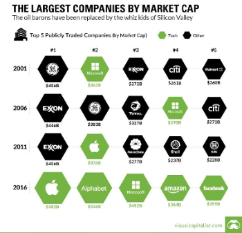 The image of the evolution of the largest market capitalizations in the US shows how the most valuable businesses evolve from old-fashioned resource intensive businesses to new technology.