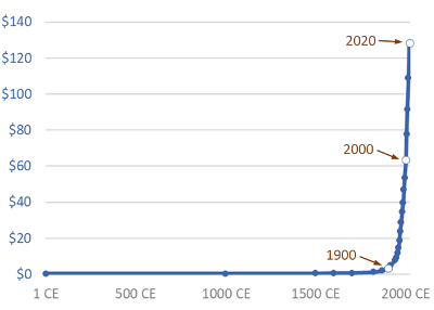 Global economic wealth production is quite exponential when looked upon a long time frame, since the Agricultural Age through the Industrial Age. Lately, it has spread to many more countries and people, sustaining this exponential growth.