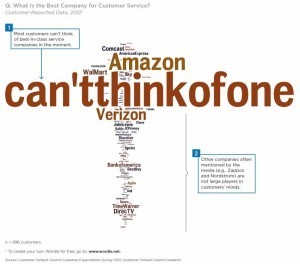Admittedly, Amazon gets a lot of buzz, and their name was fairly big in the word cloud … but “Can’t Think of One” absolutely crushes them in terms of size. In fact, those companies that are often spoken about in the media and that we, as service executives, tend to think of as being the gold-standard, actually didn’t pop up very often at all.