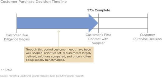 In fact, our research this year shows that customers aren't even contacting suppliers until they are, on average, 57% of the way through their purchase process. This means customers have already determined their needs, completed due diligence, and have even begun to do some comparison shopping before contacting your reps. As such, the opportunities for sellers to influence how customers value a given solution has significantly decreased.