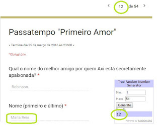 E, para animar este domingo de Páscoa, nada melhor do que oferecer um livrinho.O passatempo para ganhar um exemplar de "Primeiro Amor", de James Patterson, terminou na noite de 25 de março de 2016, tendo recebido 54 participações. O Random.org indicou que o contributo vencedor é o número 12, que corresponde a... Maria Reis! Parabéns, Maria Reis, e atenção ao seu e-mail que irei entrar em contacto consigo para lhe enviar o seu livro.A todos os outros que tiveram a gentileza de participar neste passatempo, o meu obrigado e votos de boa sorte para os próximos passatempos ;-)