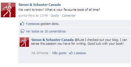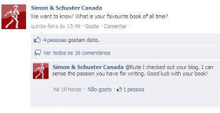 Throughout this week I will be working far from home, which means I can't write. But it's ok, I'll use the free times to read, even because reading helps me to write better (to diversify the vocabulary and the adopted tone, for example).What happened in the last days? I received the first rejection of a publisher: "Our Editorial Board has issued a negative opinion regarding the feasibility of publishing this book, once that there is no availability in our super overload publishing plan", they said in an e-mail. Of course I was frustrated, "no" is never easy to hear, but I was already expecting this negative answer, since it is a publisher of great importance and it usually isn't very receptive to receiving manuscripts.If this news made me sad, to redress the balance one thing made me happy: Simon & Schuster Canada wrote on Facebook that they checked out my blog and that it conveyed the passion I have for writing; they concluded by wishing me good luck with the book "Perdidos". It's not like they are going to publish my book or something like that, but it is always nice to know that someone hears us and encourages us to continue to do what we like. For these reasons, I can only thank them; I must also thank to all who visit this space and have the patience to read what I publish.