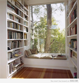 Hum... este cantinho literário parece-me acolhedor - gosto do uso da madeira, das luzes, da "cama" convidativa, dos livros ali à mão... Acho que o experimentava. E vocês?