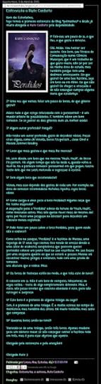Na minha opinião (e como já tinha falado com a Rute). Torna-se cansativa a leitura, uma vez que ao mudar de linha quando vamos a ver passamos duas abaixo ou uma acima, e tendo em conta o tamanho da letra (para mim) torna-se ainda mais difícil pois a minha vista começou a desfocar (sim sou meio cegueta e tal, e quando esforço a vista, ela começa a desfocar e a chorar, parece que estou a descascar cebolas). Mas nada que uma boa formatação não resolva (aumento da letra e por ai fora).3º Uma coisa que no meu ver acho que deve ser mencionado é... há alturas em que a autora usa termos em brasileiro. De inicio pensei, ok é brasileira, mas depois parei e pensei, nop ela escreve pt-pt e só usa uma palavra ou outra em pt-br, ate poderia passar-me ao lado, se não houvesse em pt.ex: ... não conseguia enxergar.... "não conseguia ver...."são pequenas coisinhas que devemos ter em atenção, mas que muitas vezes nos passa ao lado. Não estou a dizer isto para mal da autora, nada disso. Mas escrever em pt-pt e usar uma palavra ou outra em pt-br não e bom, principalmente para leitores mais picuinhas. Afinal de contas tanto o leitor como o autor, queremos ambos o mesmo. Perfeição »