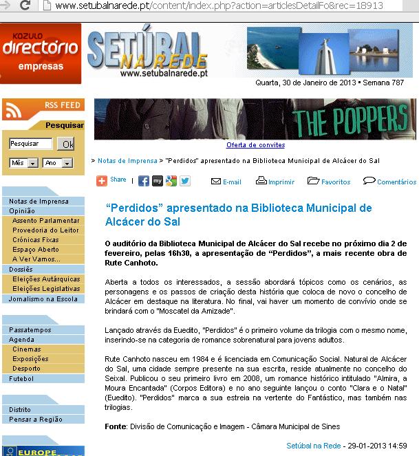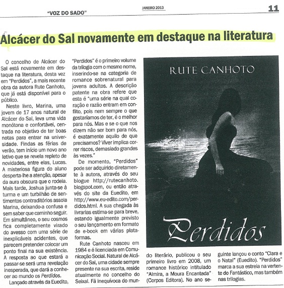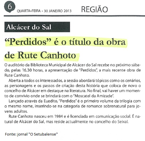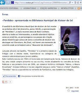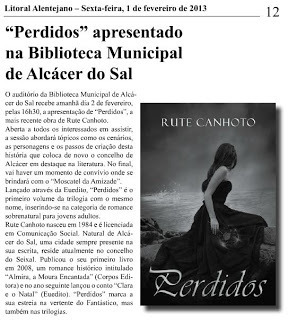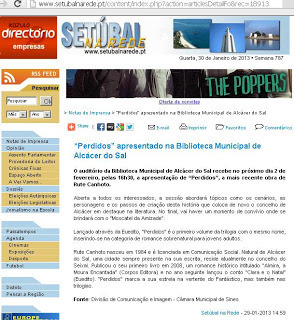 ...aqui está um vídeo com a apresentação do meu livro "Perdidos", que teve lugar na Biblioteca Municipal de Alcácer do Sal, no dia 2 de fevereiro, pelas 16h30. O segundo vídeo é a minha entrevista ao programa da RTP 1 "Praça da Alegria", no dia 7 de fevereiro. Espero que gostem =)