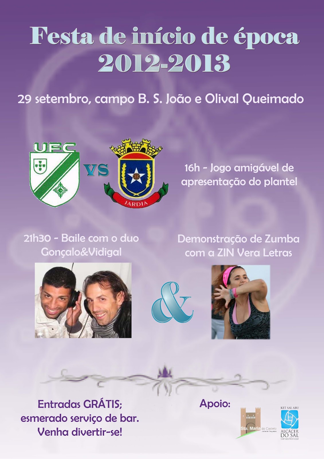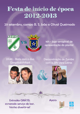 Sei que este convite nada tem a ver com livros, mas - e uma vez que sou também administradora do blogue do União Futebol Clube - não posso deixar de o fazer.Se alguém passar por Alcácer do Sal este sábado, venha à festa do UFC dos bairros Olival Queimado e S. João! Às 16h realiza-se o jogo de apresentação do plantel do União para a época futebolística 2012-2013 contra a formação da Jardia, e à noite (21h30) há animação musical com Gonçalo e Vidigal e demonstração de Zumba com a ZIN Vera Letras ;-)