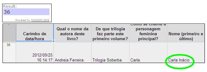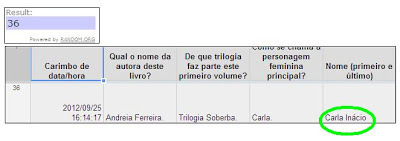Segundo o sorteio feito através do Random.Org, a entrada vencedora é a 36ª, que pertence a Carla Inácio, de Lagoa. Parabéns, Carla! O livro segue por correio amanhã.