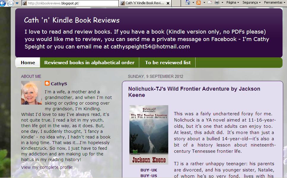 Nome: Cath 'n' Kindle ReviewsLink: http://cnkbookreviews.blogspot.com/ Administradora: Cathy Speight