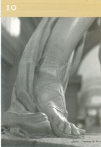 (AUTHOR’S NOTE: This flash fiction was written during a writers group meeting I attended. I was given a postcard with a photo and told to write a story inspired by it. I scanned the image and included it below. I thought at first it looked like a woman’s foot wearing a dance shoe, but then I thought it looked like a foot wearing a Greek sandal. That brought about this little tale. Enjoy!)