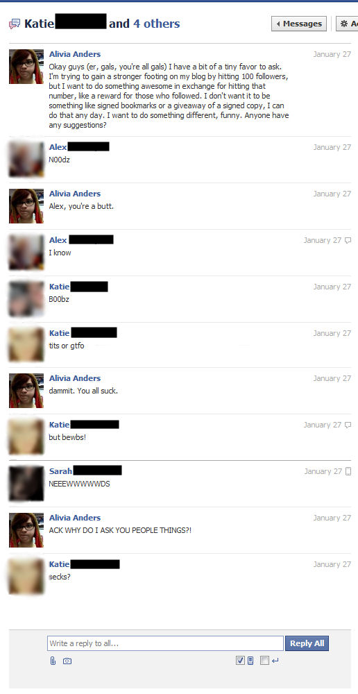 In my supreme desperation to make it look like I wasn't neglecting my blog, I sought out a couple of my closest friends on Facebook for some advice on engaging my followers and bringing more. I did have a theory of doing the whole 'giveaway' thing, but I wanted to hold off on that first and just be me. Maybe post pictures of my pre-brain days when I was RPing, or maybe let you guys in on why I can't say the words 'bakery' and 'muffin' in the same sentence without snickering. (/snicker) But before I could test my theory, I asked my friends for tips and help, stuff awesome friends should have tucked in their back pocket. This is what I got.