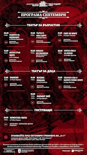 "Тя се изсмя. И сякаш порасна.Допреди миг беше дете. Така ми изглеждаше. Едва преминала пълнолетие. И думите й бяха отнесени. Самата наивност в дъждовна нощ.Чела беше, много. Вярваше в книгите. Може би пишеше? Знам ли, така и не разбрах. Нищо не помня от думите й. Чувах ли ги изобщо? Красиви бяха. Но не се вписваха в реалността. Когато се изсмя обаче...Това беше смях на жена. Достатъчно зряла жена..."Из "Кратка пиеса за любов"28.09. 19 ч. Драматично-куклен театър "Иван Радоев" - ПлевенКасата отваря утре, а билети онлайн може да си купите от тук