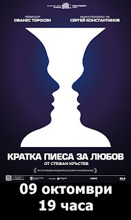 На 9 ноември от 19 часа ще ви чакам в Драматично-куклен театър "Иван Радоев" - Плевен.Ще бъда сред публиката, най-вероятно на онова ъгълче, от което винаги гледам пиесата.На сцената ще е Сергей Константинов и ще разиграе една "Кратка пиеса за любов", а кратка пиеса за любов е целия ни живот, дори когато си мислим, че любовта отсъства.Неизбежно сме я търсили, неизбежно сме я пропилявали, неизбежно сме я откривали в непознатата, непознатия, в децата или в Бог или в самото й търсене и авантюрата. Той ще ви разсмее.Той ще ви просълзи.Той ще ви заприлича на някой ваш близък познат, който ви й ядосва, но който й разбирате.В магико-реалистичната атмосфера създадена от Ованес Торосян, една магико-реалистична история, като тези, които обикновено пиша, но от най-добрите.