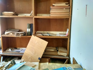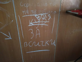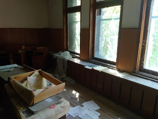 Влизаме навътре. До стаичката на охраната. Представям си духът на охранителя, който не може да опази училището от навлизането на новото. Времето, в което то-училището, няма да е вече необходимо. И времето, ветровете на промяната ще вандалстват и унищожават.