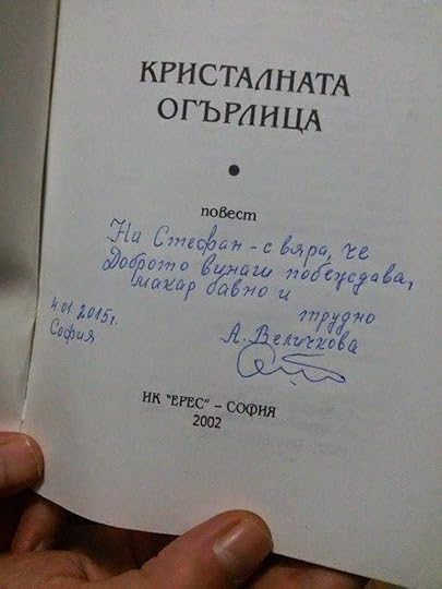 Изключително издържан героичен епос. Голяма наслада ми бе да го прочета. Очакват ме „Обратната страна” и „Седем възела и седем пробуждания” от Ана Величкова.Не знам, може ли да се открие някъде „Кристалната огърлица”, не знам изобщо могат ли да се открият по книжарниците книгите на Ана Величкова. Ще преглътна гнева, който ме обзе докато написах горните два реда. Ще го потуша, в името на ценностите за които иде реч в книгите на Ана Величкова. Но тя не е лигава телевизионна звезда, че да са изложени книгите й на всяка книжарница и чаршия, и да са сред най-продаваните книги за годината в България, а една от знатните дами на българската фантастика. Творила и вдъхновявала нас следващите поколения вече десетилетия. Истинско щастие е, че въпреки възрастта си е сред нас. Тук във фейсбук. Намерете я. Харесайте страницата й. Може и да не се откриват книгите й по книжарниците, но заслужават да бъдат дори в учебниците. А в страницата ще откриете повече отколкото на пазара. Тук.
