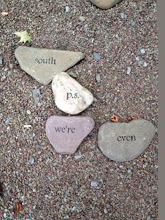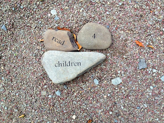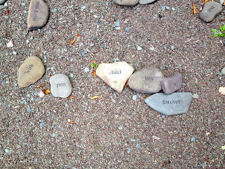 (While looking for a picture of Stacey and me, writing our hearts out in Honesdale, instead I found these poetry rocks that inspire Highlights workshop writers and make them smile. But do click on over to Stacey's post this morning to find out more about her, see pictures, and comment to win my books. Did I say I love making writing connections?)