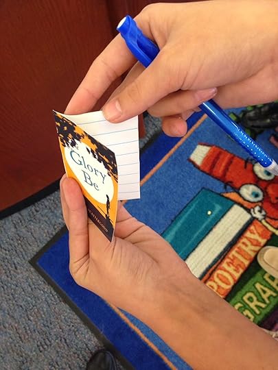 (Jennifer, a teacher with a whole bunch of stickies in her copy of Glory Be. Actually, many of the teachers, volunteers and especially librarian Jan Hager had read and prepared the students so well. Thank you Curtis Fundamental School!)