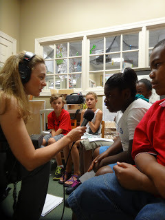 Mississippi Public Broadcasting's Sandra Knispel records one of Kelmisha Jackson's questions.