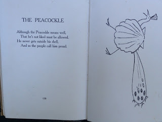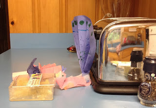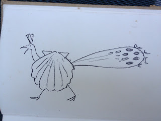 Here's our paper collage version of peacocks, decorating the modern-day kitchen (circa 1960s maybe), propped up on the honeycomb. (Quite a conversation piece. And delish honey.)