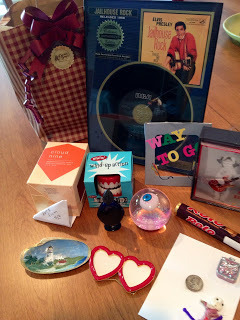 They presented me with my own little Junk Poker box! Filled with all sorts of treasures, including a piece of "Elvis's wallpaper" that's very close to the real thing. Those kids are careful readers. Wow.