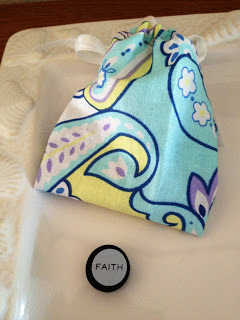 Our fearless leader Teddie Aggeles gave us gifts (she made the adorable blue bags for each member). Colorful paper clips, tiny writing pad, candy-- I thought I'd looked carefully at the treats inside. But I'd missed one. See that tiny eraser?