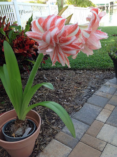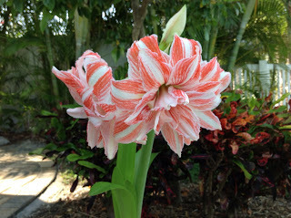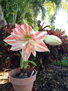 Did I say I now live in Florida? I know nothing about growing tropical plants. But the bulb seemed healthy so I hid it behind a shady palm, near a fence, and promptly forgot about it. Till about a month ago. It was well on its way to having six blooms. I admired it often.