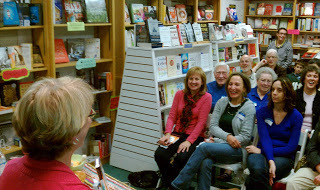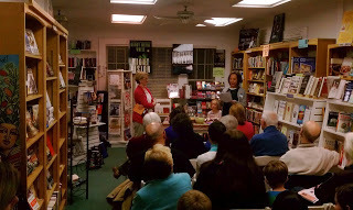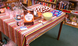As you can see, the room is quite tiny. Seating for 25. Extras sat on the floor, stood in the back, and one special guest sat at the table, offering moral support, guarding the books and the food. (Thanks, Evie!)