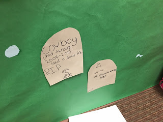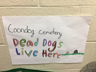 Of course, I just HAD to go upstairs to see that the entire hall in front of their classroom was a Coon Dog Cemetery. Straight from the book!