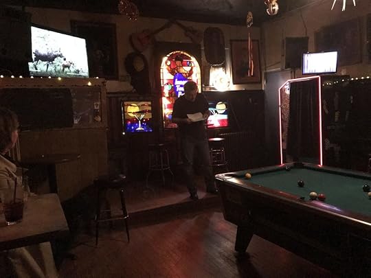 Anyway, we settled into a couple of tables. There were a few regulars (and by “regulars” I mean “30-something drunk boys and girls”) playing pool and we asked if they would mind if there was a reading.