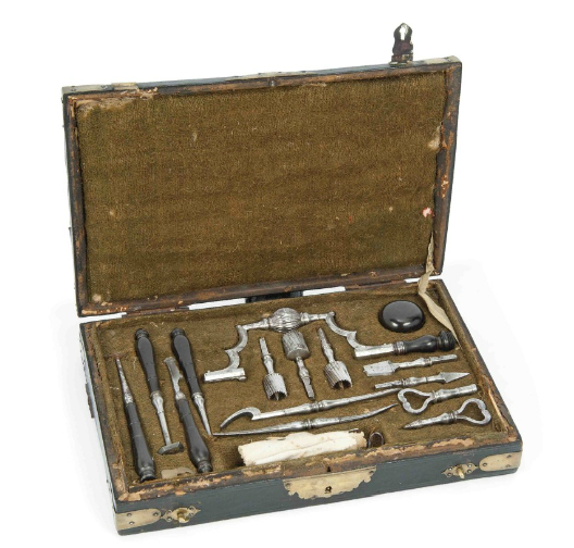 A FRENCH TREPANNING SET, Leseur, late 18th century. Signed on the drill LESEUR also with a punched maker's mark of a crown over an A, drill-heads, perforators, elevators, lenticulars with turned wooden handles, in fitted case. 13.5in. (34.5cm.) long in case.