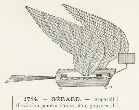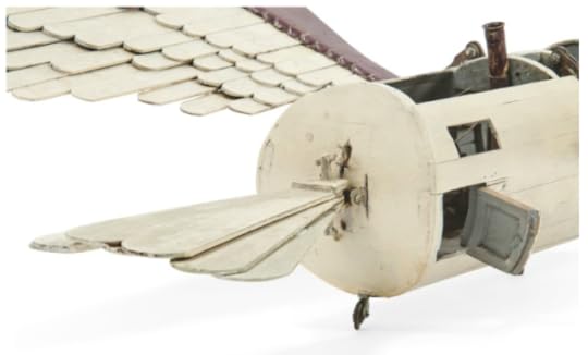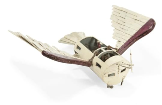 A MODEL OF THE 1784 GÉRARD FLYING MACHINE, FRENCH, LATE 19TH CENTURY. Painted wood and metal model with two wings on model engine mechanism, the tail feather and forward rudder operated by two interior handles, two opening doors, on three wheels. 21in. (54cm.) long.