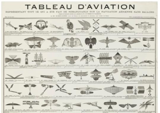 TABLEAU D'AVIATION , French, Circa 1880. Lithographed poster illustrating mechanical flying machines from 1500-1880, by E. DIEUAIDE, 18, Rue de la Banque -- Paris, backed on linen. 21½ x 27in.