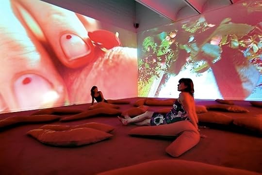 A few days ago I stopped by the Hayward Gallery in the Southbank Centre to see the new Pipilotti Rist (Swiss, b. 1962) retrospective that opened September 28. Wow. I watched a video installation of hers at the Museum of Contemporary Art Chicago last month, and really enjoyed the purposeful plush carpeting, bean bag chairs, and low lighting that were part of the experience of her video work. That conceit was used again a number of times in Rist's installations at the Hayward Gallery (which, by the way, managed to make very good use of the space, with tiny cubbyholes to discover and videos projected in very unlikely places: a stall in the women's restroom and the inside of a conch shell). Rist provided cushions (some as stuffed shirts and pants meant to look like cartoonish disembodied people) that forced you down on the floor and on a new visual plane in order to experience and visually interact with the viewers around you. Body (especially the female body) and forcing the viewer to become conscious of body in space and in relation to a projected image plays a huge role in her work. There are lovely video glitches, too, and a use of the machine in unexpected and often startlingly or strangely familiar ways.