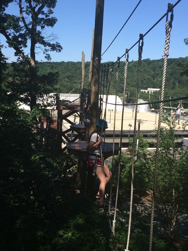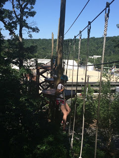 This is what happens when I let my husband plan family outings.One day while driving somewhere (we’re the parents of two teens with lots of local family—we’re always driving somewhere), we passed some people flying through the trees. Since this isn’t an ordinary sight, we paused, and realized they were swinging through a ropes course.“That looks fun,” my husband said.I agreed, which means I’d either not had enough sleep, was agreeing with him at the time so I could soften him up to argue with him later, or just wasn’t paying attention.He decided it would be a great Father’s Day activity. Well, our Father’s Days are spent with both sets of grandparents, so clearly, this was not something we were going to do on any actual Father’s Day. We’d make plans to do it on a weekend close to the holiday, but due to school schedules, camp preparation and other life craziness, we never found time to get to it.This year, he put it on the calendar. As soon as I heard my daughter’s exam schedules and departure days for sleep away camp, and realized we’ve done no preparation at all for packing, labeling or anything else, I gave him the look—the look that says, “I don’t want to tell you we’re not going to do something, but we’re not doing something.”And he gave me his disappointed look. So I caved and suggested we go yesterday. Hey, I was being spontaneous, something that hasn’t happened since approximately 1998.Oldest child flat out refused to go with us. She’d already been with youth group and claimed to have barely survived. She’s a little dramatic, so we ignored her warnings and told her to start packing.I should have listened to oldest.I thought I was being prepared by bringing bug spray. I mean, we’re in trees, there’s bugs, what else could I possibly need?People tell you to conquer your fear. They tell you to not show that fear to your children. They tell you not to give up. My husband says, “You’ll be proud of yourself when you finish.”In the future, I’m not listening to “people.” As for my husband, well, the jury’s still out on that one.Because it was most definitely the scariest thing I’ve ever done. I thought my biggest problem would be a fear of heights. No, my biggest problem was fear of landing. Because even though I was attached to a harness, it didn’t matter whether I was close to the ground or really, really high off the ground. As I tipped and shook and got blown by the wind and cursed my way across the different challenges, my biggest fear was that if this stupid harness breaks and I land on the ground, it is really, really going to hurt.