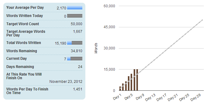 Things are going well, on this writing end. It was a slow start for me. Day 1 and 2 I was really pushing for word count as I waited for the story to come to me. Then the weekend hit, and I finally got that spark I was needing. Though I might not be writing as fast as I have in other years, I am still happily ahead of the game and moving along.